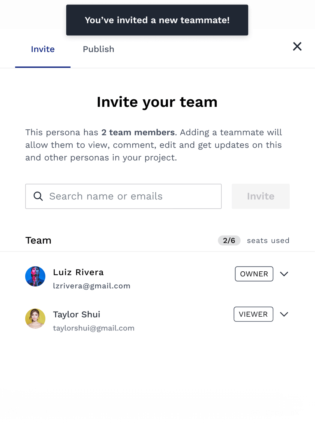 Invite your team mates into project, personas and research via email.